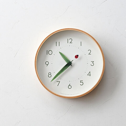 葉っぱとてんとう虫をモチーフにした、やわらかな印象の掛け時計。1時間に一度、葉っぱの針の上に、てんとう虫が重なります。