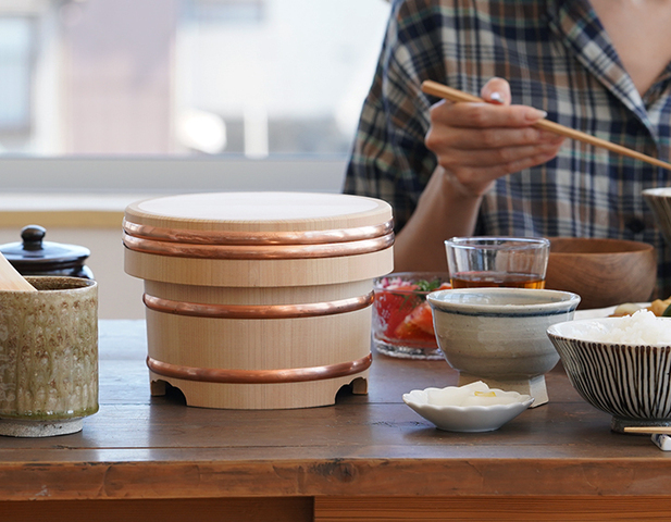 ツヤのある木肌と銅のタガで締められた昔ながらの江戸びつ。使用するうちに銅の色が味わい深く変化し、趣のある佇まいはキッチンで見せたくなる暮らしの道具です。