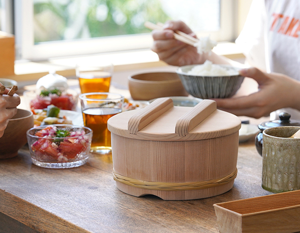 食卓がちゃぶ台だった頃、おひつは床の上で使用していたため深さがありました。テーブルと椅子に代わった現代の生活様式に合わせるよう作られた日樽のおひつは、使いやすく現代の食卓によく馴染みます。