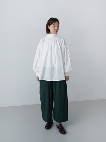 身頃と袖にギャザーを寄せ、ふんわりとしたシルエットが特徴のギャザーシャツです。衿と袖口にリブ編みを用いることによって、甘さを抑えたデザインに。古着のスモックのような雰囲気が、可愛らしいです。