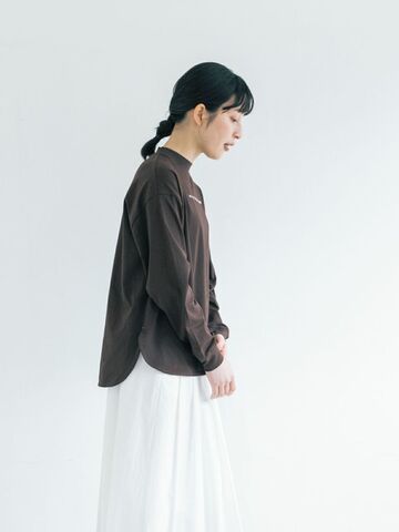 身体の線を拾わないシルエットにモックネック、スウェット風のリブ付の袖口など大人も1枚でさまになるTシャツです。