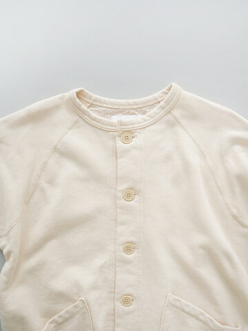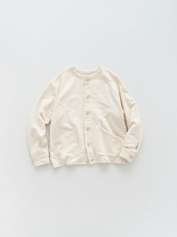 裏毛素材を使用したカーディガンです。シャツやカットソーの上から余裕をもって羽織れる、ゆったりとしたサイジング。動きやすいラグランスリーブで、気軽に着ることができる便利なアイテムです。