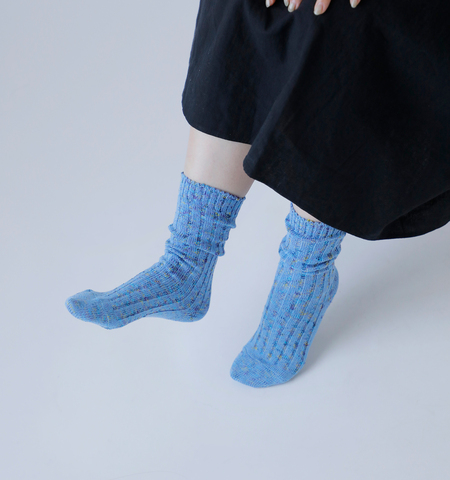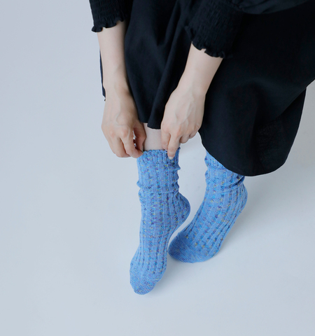 meri ja kuu(メリヤクー)よりコットン リブ クルー ソックス “KASURI rib”のご紹介です。ローゲージのジャガード機を使用し、ビビットなカラーで編んだ、太リブのミドル丈靴下です。あえて内側にカラフルな絣のスラブ糸を入れて、色が点々と表面に混ざって見えるような編み方をしました。くしゅくしゅとたるませて履いて頂ける、使いやすい丈感。鮮やかなカラー展開で、ボトムの裾から覗かせるアクセント使いにぴったりです。