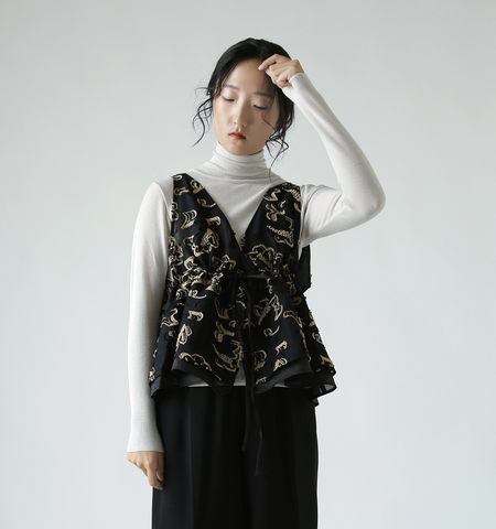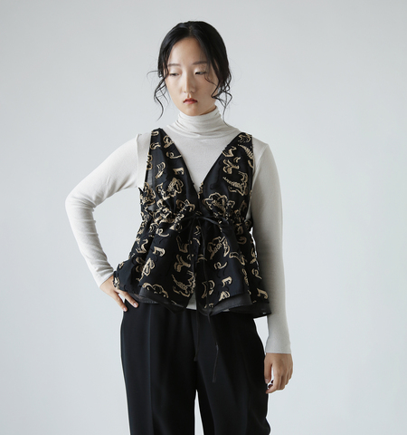前開き仕様で胸元のリボンを結ぶデザインですのでジレ風に羽織ることも可能です。