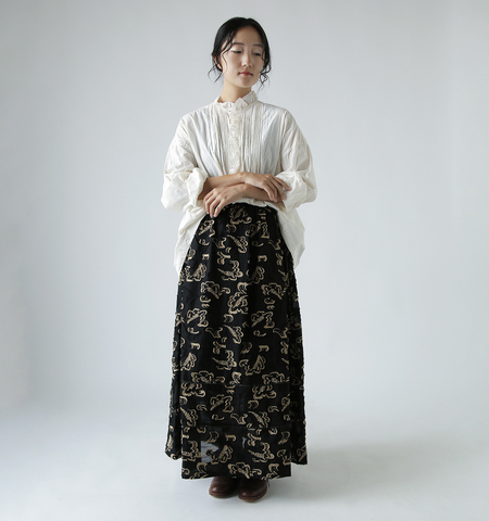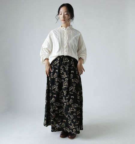 薄手ながらふんわりと膨らみを感じる繊細なファブリックで、裏側はさらさらとした質感です。立体感のある表地は透け感があり、独特の揺らぎを感じるどこか幻想的な雰囲気。キュプラ100%の裏地が一体となっており、滑らかな穿き心地です。