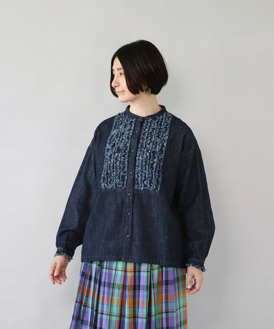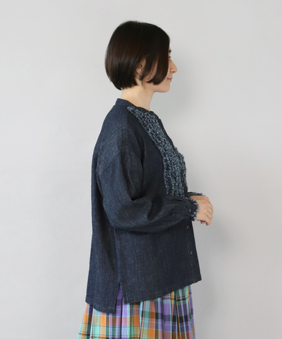 blue willow|コットンリネンの フリルブラウス