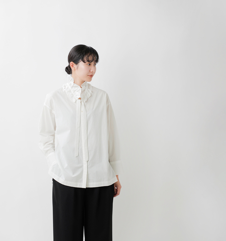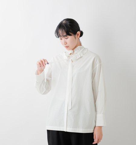 フリルを付けたスタイル、外したスタイル、さらにフリル単体をニットやカットソーに合わせるスタイルの3way仕様で幅広いコーディネートを楽しめます。ボディはすっきりとしたキーネックに比翼仕立てで、フリルの有無を問わず上品でバランスの良いデザインに仕上がっています。