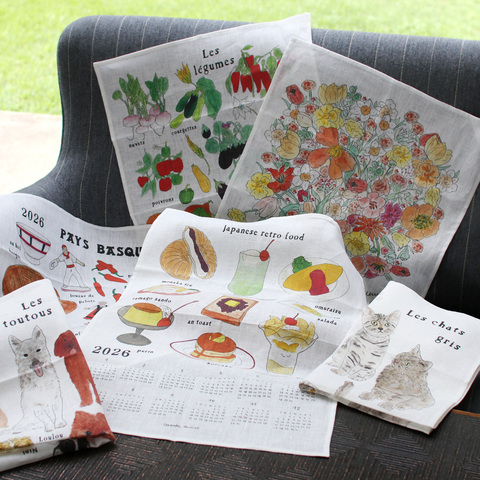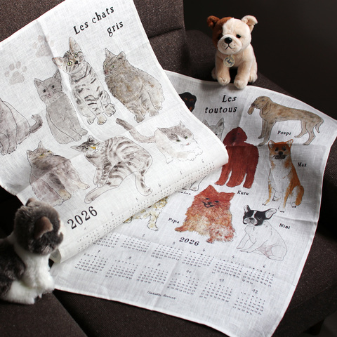 fog linen work の2026年版リネンカレンダー。キッチンクロスサイズのリネンにイラストとカレンダーがプリントされています。