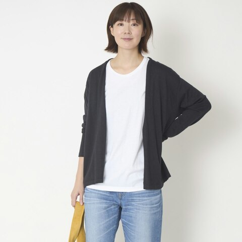 ニット素材で体にフィットするからこそ、カーディガンは実は肉感を拾いやすいアイテムです。シンプルなクルーネックのぴったりとしたカーディガンをボタンを留めて着るのは、年齢を重ねて丸みを帯びた体型にはハードルが高い……、けれども、ゆるっとしたシルエットはシーンによってはコーディネートが難しい。そこで、こちらは思い切ってボタンをなくしてさらりと羽織れるデザインにしました。