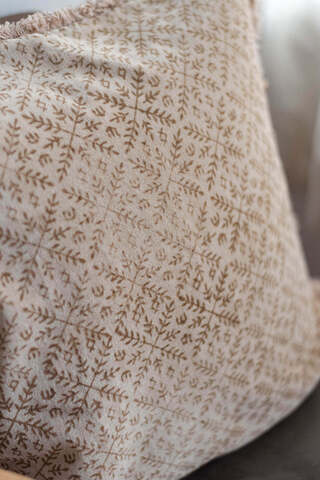 ポン、ポン、と木版を押す音が聞こえてきそうな、手しごとのぬくもりを感じるクッションカバー。