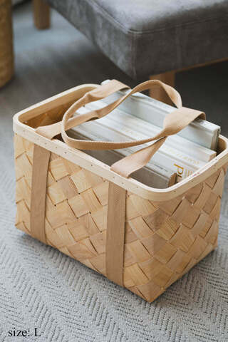 Snokka Basket Bag - ベージュの持ち手がやさしく映える、もみの木のバスケットバッグ
