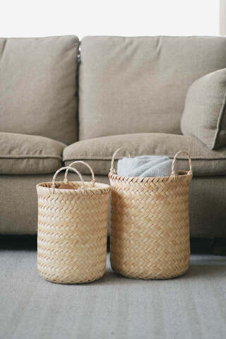 ブランケットや毛布をくるくると丸めて入れておけば、ソファ横やベッドサイドで"使わないときの居場所"に。いつでもさっと取り出せて、バスケットごと持ち上げられるので、掃除もスムーズにできます。