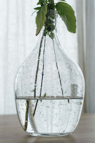 クリアで優しいフォルムには、職人の温もりある手仕事がそっと息づいています。ガラスに浮かぶ気泡は、軽やかさと遊び心、そしてどこか静かな動きを感じさせてくれます。水を入れて光の差し込む場所に置くと、気泡が光をまとい穏やかな輝きを放ちます。