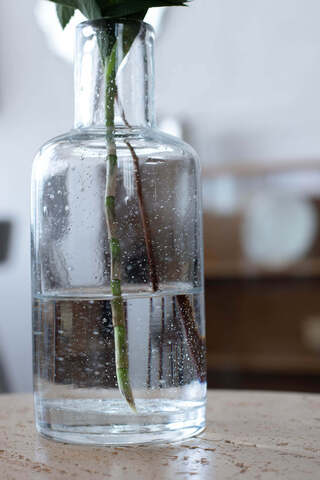クリアで優しいフォルムには、職人の温もりある手仕事がそっと息づいています。ガラスに浮かぶ気泡は、軽やかさと遊び心、そしてどこか静かな動きを感じさせてくれます。水を入れて光の差し込む場所に置くと、気泡が光をまとい穏やかな輝きを放ちます。