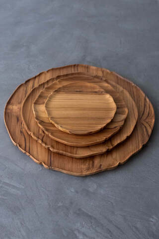 ラウンド型で縁に繊細なカーブデザインが施されているフォルム。チーク材ならではの温かみが加わり、料理を引き立てるだけでなく、テーブルを心地よい雰囲気に仕立てます。