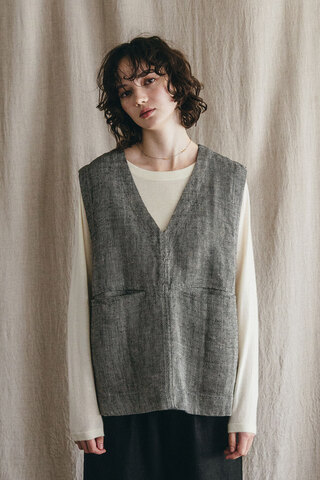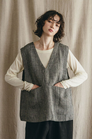 厚手のリネン生地で仕立てた、存在感のあるジレ。深めのVネックとスリットポケットが大人っぽくきれいめな着こなしにもぴったりです。