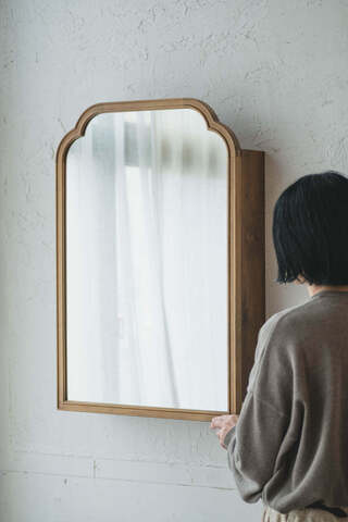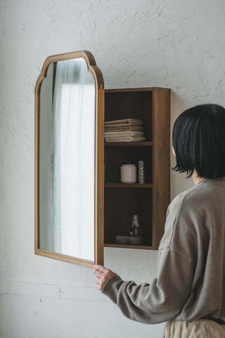 実用性はもちろんインテリアとしての個性も持ち合わせた「Wood arch キャビネットミラー」。ミラーで日常の身支度やスキンケアをしつつ収納も確保したい洗面室に、コンソールテーブルやミニデスクと組み合わせてドレッサーとしてなど、幅広いシーンで活躍してくれます。