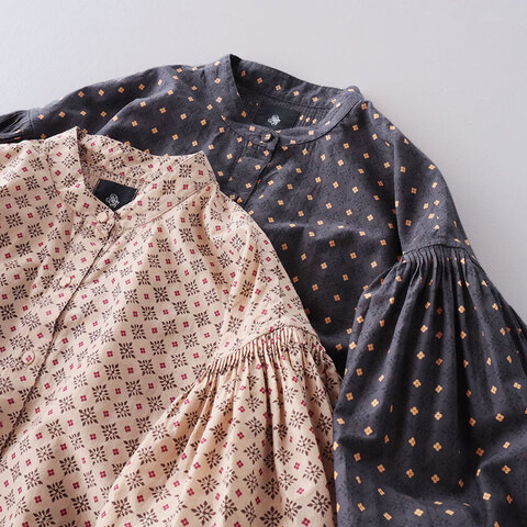 ふわりと柔らかな心地よい肌触りのコットンボイル生地を使用。空気を纏うような軽やかな着心地が魅力で、おでかけスタイルにも最適です。落ち着いたトーンのベース地に映える配色の小花柄とベースと同系色の幾何学模様のような花柄を規則正しく整列するように並べたプリントデザイン。プリントは一色ずつ手作業で色を重ねるハンドスクリーンで描かれており、手染めならではの味わい深い風合いを楽しめます。コントラストをきかせたプリントは奥行きが感じられ、シックな中にも存在感を放っています。