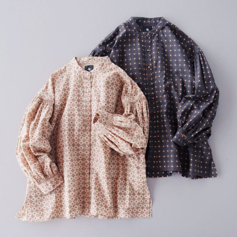 ハンドスクリーンで表現したオリジナルの花柄プリントが目を惹く「maison de soil (メゾン ド ソイル)」のバンドカラーシャツのご紹介です。