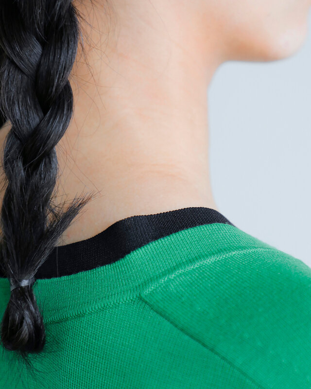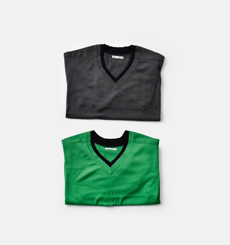 首元は深めのVネック、配色デザインが映える端正なディテール。