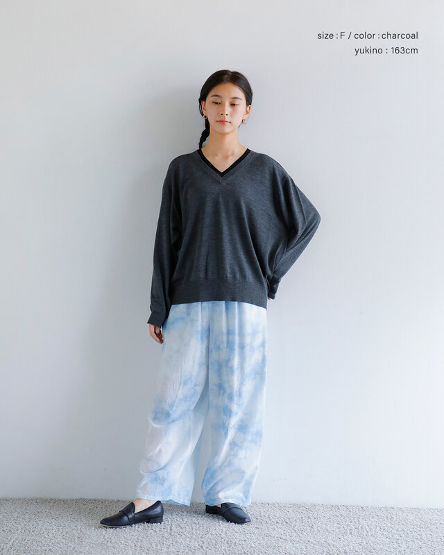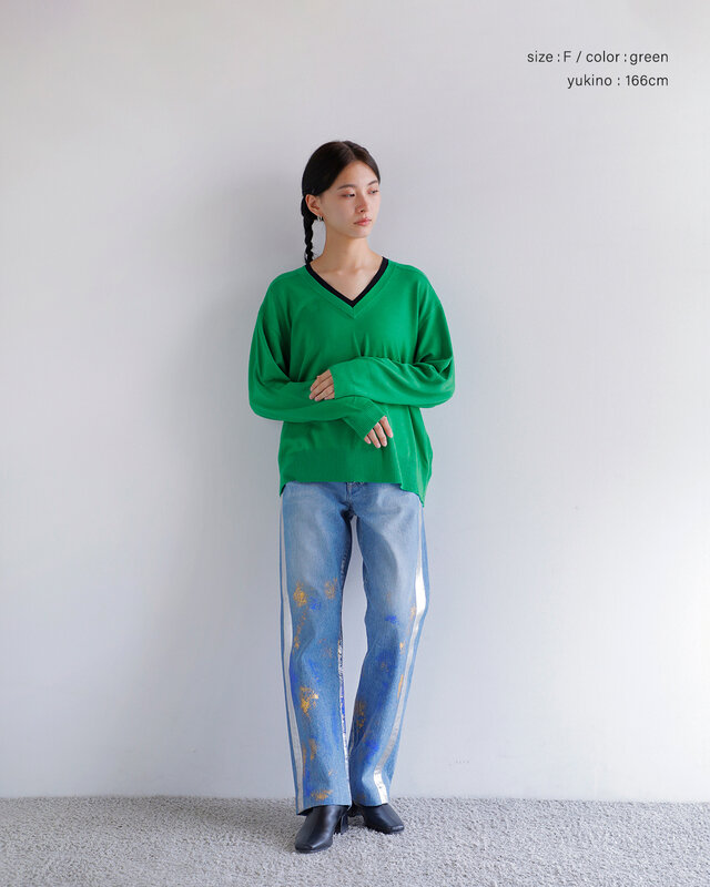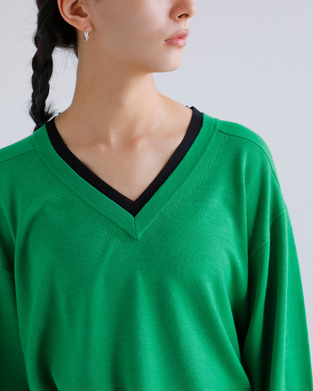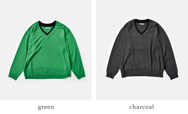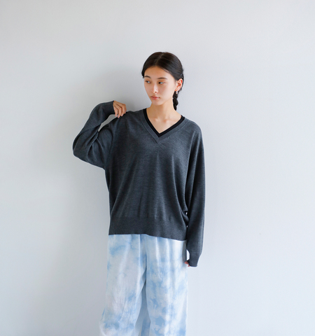 深めに仕立てたVネックは配色デザインでモード感を演出。ゆったりとしたシルエットに、裾と袖口のリブ編みを合わせ、シンプルながらもバランスの取れた仕上がりに。上質素材とデザイン性が美しく調和した一枚です。
