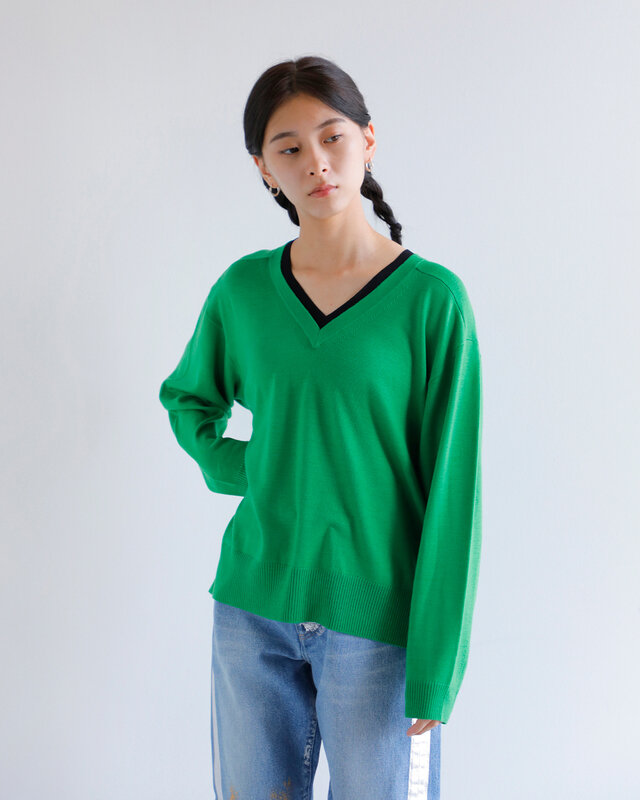 配色Vネックのアクセントと柔らかな素材感が、都会的で抜け感のある雰囲気を漂わせる。一枚です。