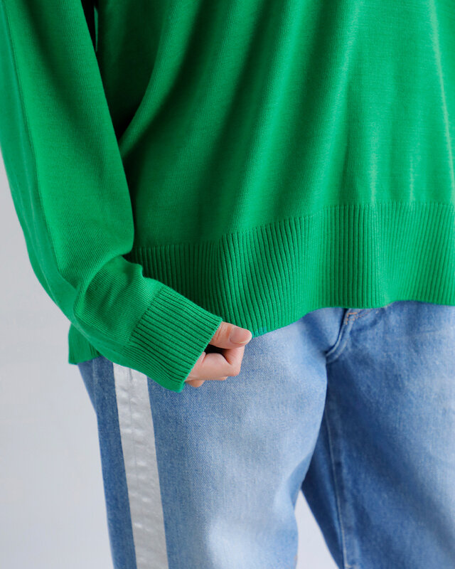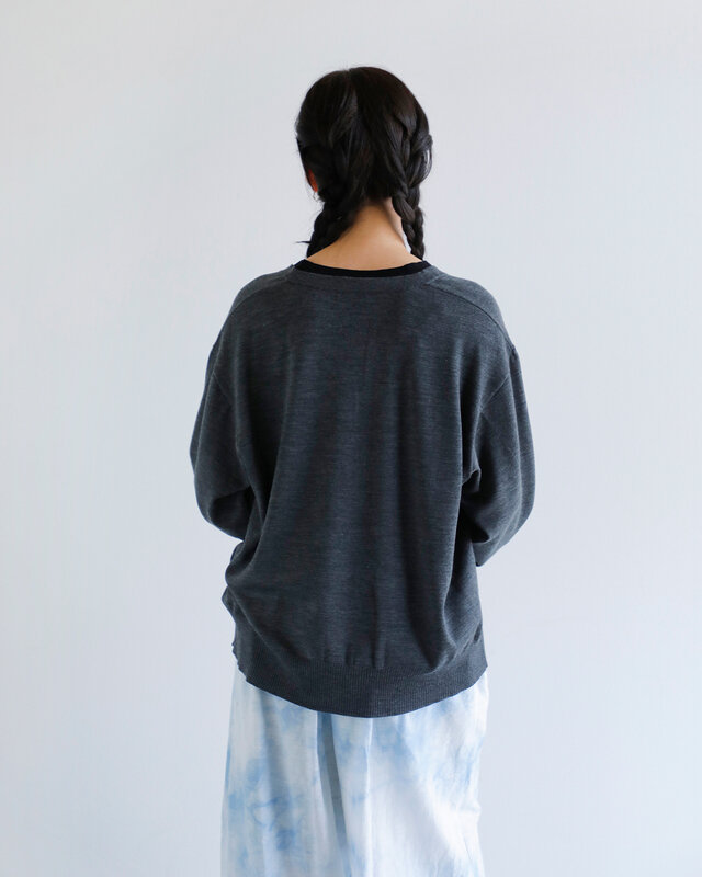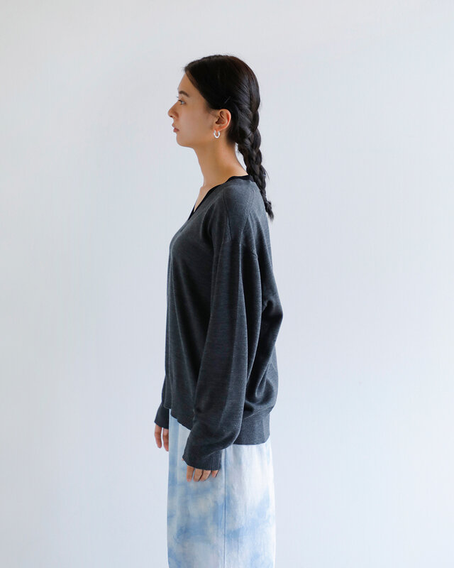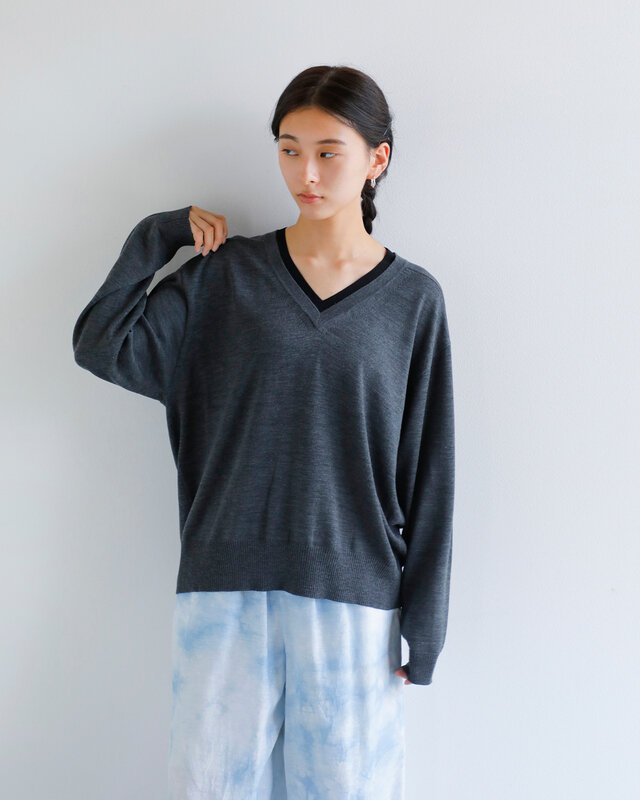 リラックス感のあるサイズ感で、深めのVネックが顔まわりをすっきりと見せる。厚みは軽やかで、秋冬を中心に幅広いシーンで活躍。オンにもオフにも馴染む一枚。