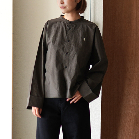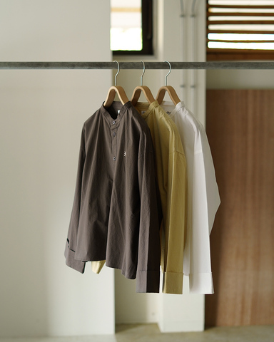 コンパクトなシルエットにワイドスリーブを組み合わせ、抜け感のあるバランスに仕上げたバンドカラーシャツ。