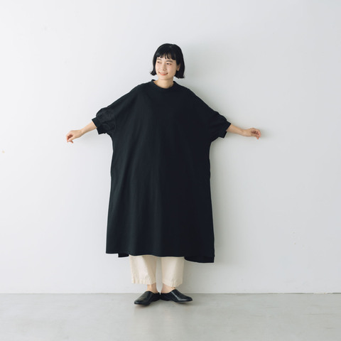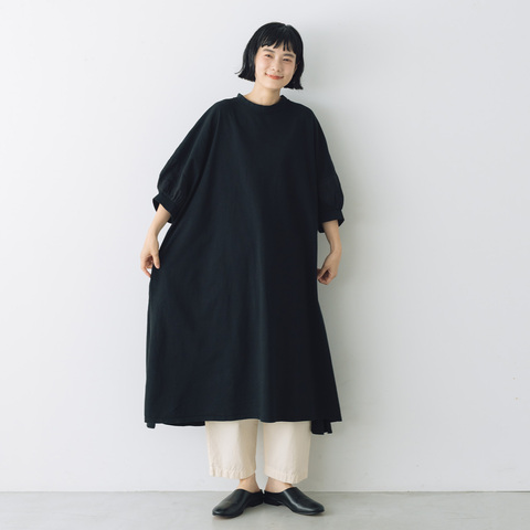 身頃はやや厚地のコットン、袖にはサラッとしたリネン素材を使ったゆったりとしたシルエットのワンピース。落ち感のあるシルエットがきれいで、首元や袖口のリブが引き締めてくれるので着心地は楽だけどだらしなくならず、1枚でスタイリングが決まるワンピースです。