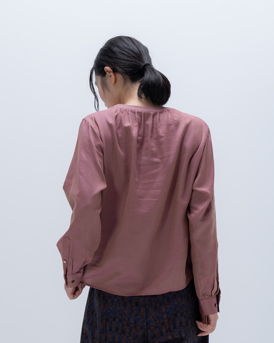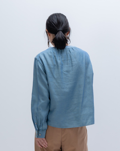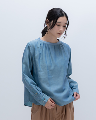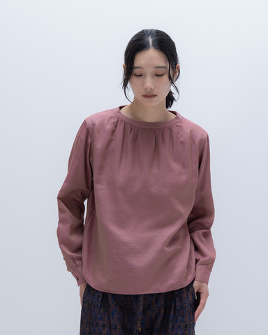 襟にTシャツのようなリブが付いており、被るだけで気軽に着られるデザイン。素材感の上質さも相まってカジュアル過ぎず、気張りすぎないニュアンスのブラウスとなっています。