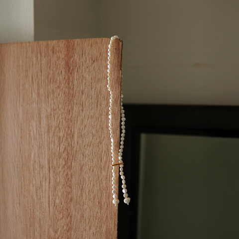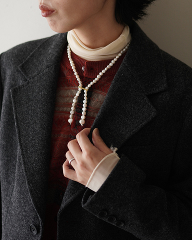 異なるサイズのパールを連ねた、表情豊かなネックレス。光の加減でニュアンスを変える真珠が、顔周りに上品な輝きを与えてくれます。