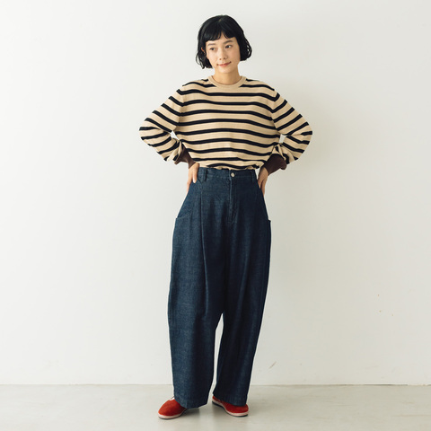 ワイドのようなシルエットですが、裾は少し絞ったコクーン型。コットン100%のデニム生地は、ワンウォッシュ加工を施してあるので、デニム特有の硬さは無くしつつ、濃紺のインディゴブルーの上品さは保っています。