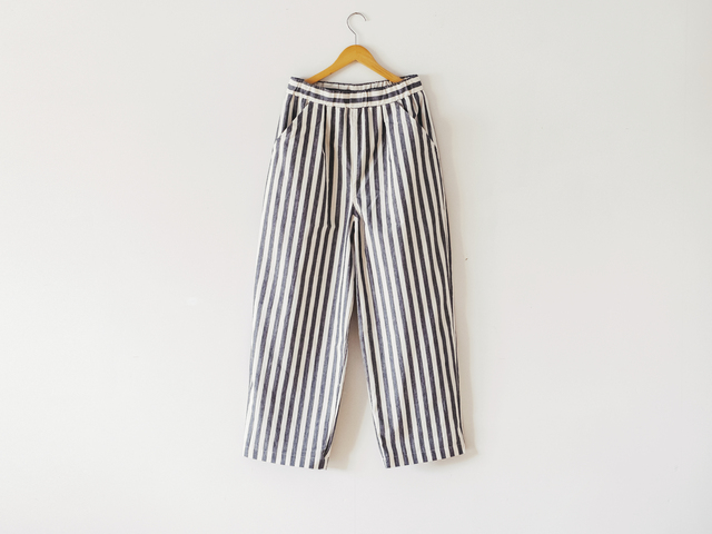 ロールアップをして裾のすぼまりを調整してテーパードにして可愛くしたり、ウェストを1折りしてすっきりと履きこなしたり、腰でずるっと履いて靴を隠したりしてみたり、シンプルに亀田縞を肌で楽しんでみたり。