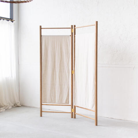 リネンコットンのファブリックスクリーンが素朴な雰囲気のパーテーションは、時を経て使い込まれた木の表情がどこか懐かしいヨーロッパの雰囲気をイメージさせてくれます。
