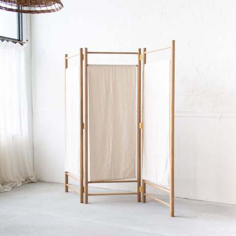 リネンコットンのファブリックスクリーンが素朴な雰囲気のパーテーションは、時を経て使い込まれた木の表情がどこか懐かしいヨーロッパの雰囲気をイメージさせてくれます。