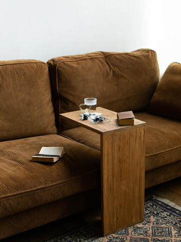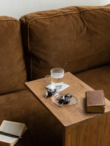 手の届く位置にテーブルを置くことができるコの字型。体を起こさず飲み物やお菓子をそばに、読書や映画鑑賞など、おひとり時間を楽しめます。