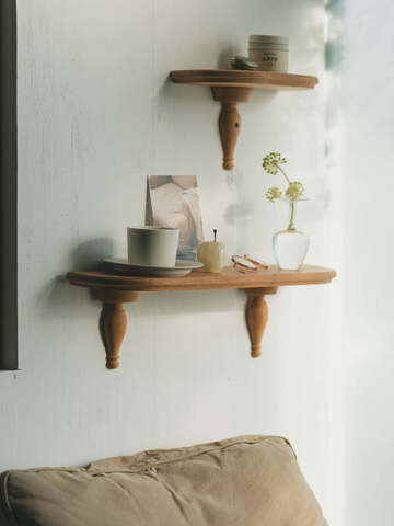 優美な曲線の天板が優しい印象を与えます。2本ある支柱の背面に埋め込み型のひっかけ金具がついており、壁に取り付けた状態がスッキリと見えるようデザインされています。
