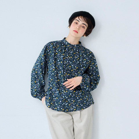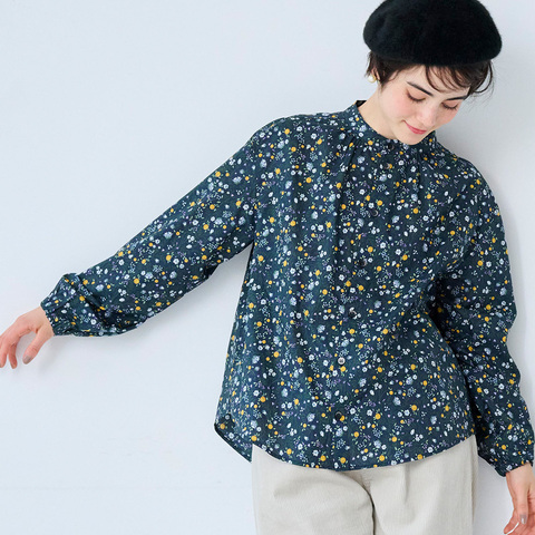 首元に寄せたギャザーと木の実柄がやさしい雰囲気を添えるシャツです。