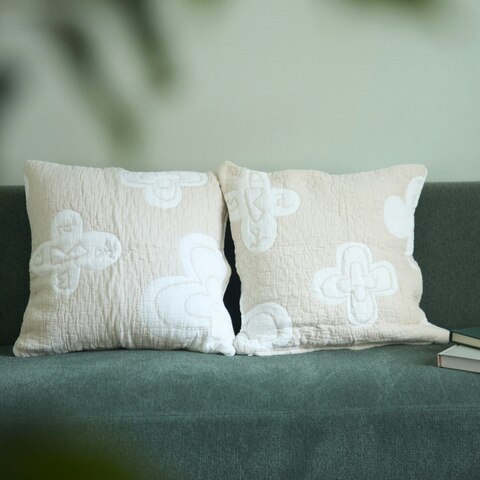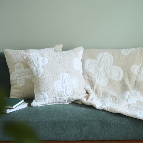 松林誠さんデザインの「菜花 クッションカバー 45×45cm」は、ふんわり軽やかなガーゼ生地にあしらった、軽快な花の模様が特徴。存在感たっぷりなのに派手過ぎず、お部屋を華やいだ空間にしてくれます。カバーを変えるだけでだいぶイメージが変わるので、ちょっと気分を変えたい時に重宝しますよ。