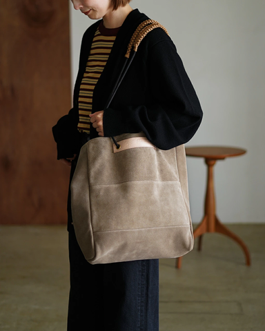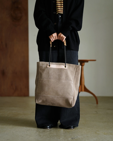 日常の相棒として頼れるサイズ感と、使い込むほどに深まる風合いが魅力のトートバッグ。柔らかく仕上げたスエードにナチュラルなヌメ革を組み合わせ、ウォッシュ加工によるくったりとした質感がこなれ感を演出します。