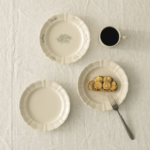 花びらのようなリムが、真ん中のお料理やお菓子を飾る額縁のような役割りに。リムが余白をつくり、どんなお料理の盛り付けも美しく見せてくれます。日常使いはもちろん、おもてなしやお誕生日、クリスマスなどのいつもと違う食卓に華を添えてくれる一枚です。