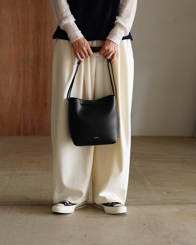上質なシュリンクレザーを使用したクロスボディバッグは、無駄を削ぎ落としたミニマルなフォルムが特徴。ベルトは引き伸ばすことでショルダーストラップに変化し、ハンドバッグとショルダーバッグの2WAYスタイルを実現。
