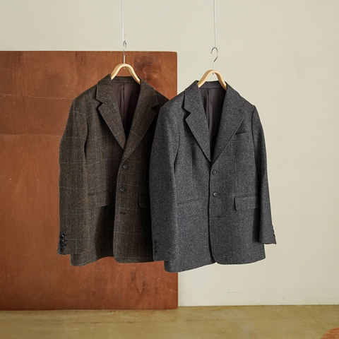 イギリスのサフォーク種とオーストラリアのメリノ種をブレンドした原毛を、国内で丁寧に紡績し織り上げたウール生地を使用しています。しっかりとした厚みと素朴な表情を持ち、着込むほどに風合いが増していくのも魅力です。