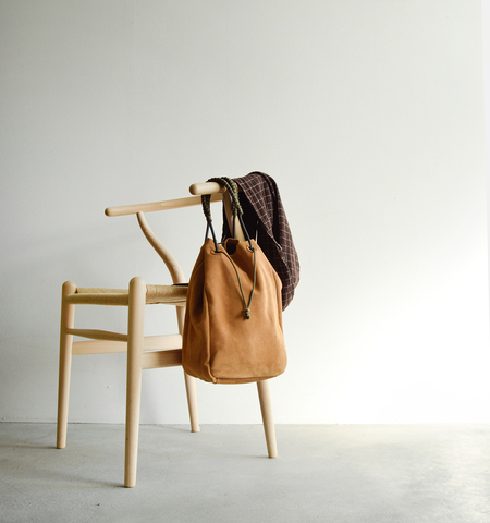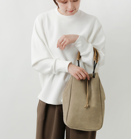 ネイティブカナディアンのカゴをモチーフに、メイン素材には手触りの良い上品な雰囲気のスエードレザーを採用しました。特徴的なハンドル部分はカナダの漁師や船乗りの使用する紐の結び方を駆使し、長さを自由自在に変更できるようデザイン。 ハンドでもショルダーでも、お好みのスタイルでお楽しみいただけます。