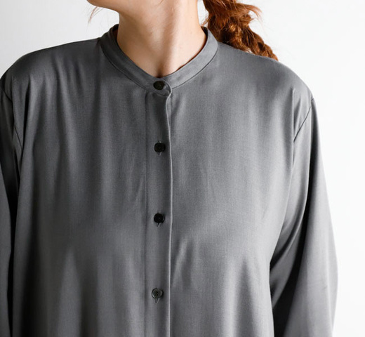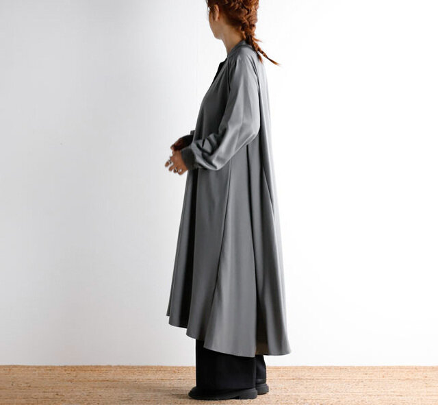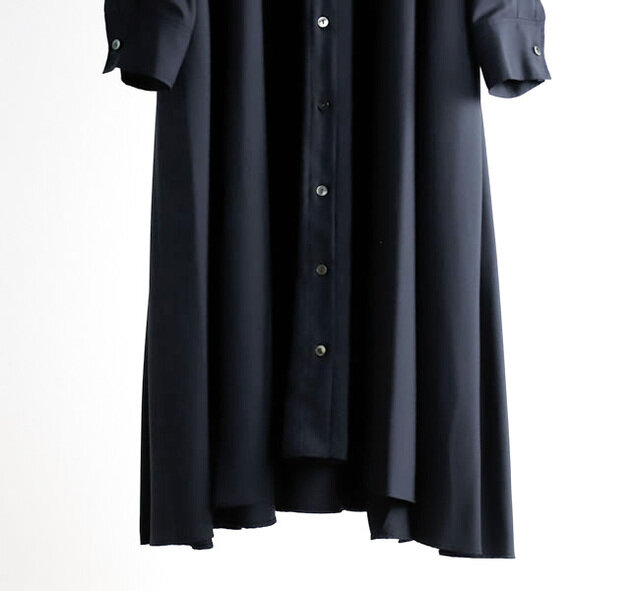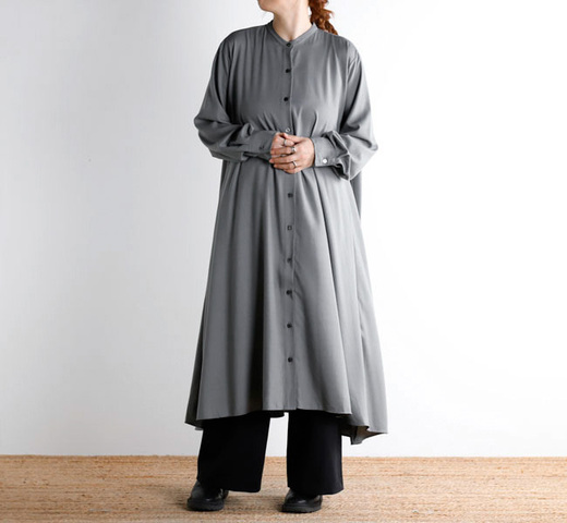 mizuiro ind定番のデザインで落ち感がきれいなT/Rスタンドカラーフレアシャツワンピースです。スッキリとしたスタンドカラーと綺麗に広がりのあるフレアラインが魅力的。若干の前後差を付けた裾のラインでパンツを穿いてコーディネートしても良く、フロントボタンを外して羽織でコーディネートしても素敵です。オケージョン対応も可能。長く人気のある1枚です。