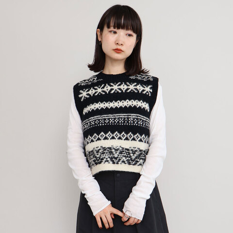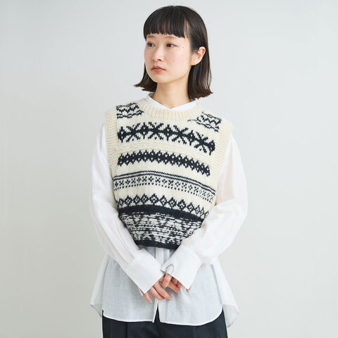 今期は手編みジャカードのベストとプルオーバーを展開しています。