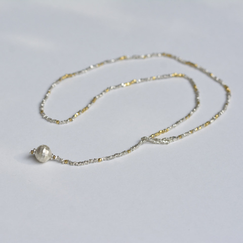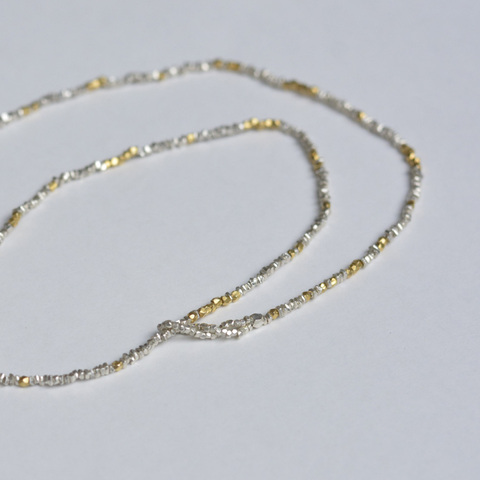繊細なカレンシルバービーズに、温もりのあるゴールドコーティングをした2色を散りばめたネックレス。