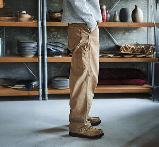 素材には本格的なワークスタイルのオックスを使用し、製品での後加工によりUSED感を表現してあります。
