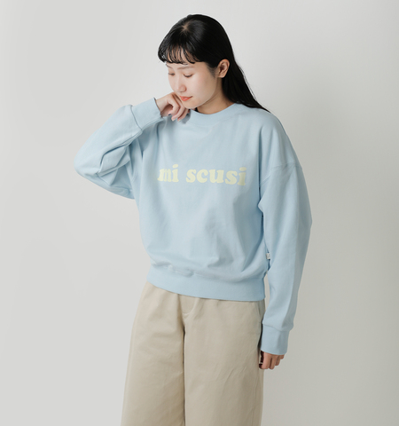「mi scusi(ミ・スクージ)」――イタリア語で“すみません”という意味のこの言葉を、あえてユーモラスにフロントに配した一着。レモンクリーム色のロゴは柔らかなアクセントになり、ウォッシュドグレイシャーの涼しげなトーンと調和。洗練されたカジュアルスタイルを演出してくれます。