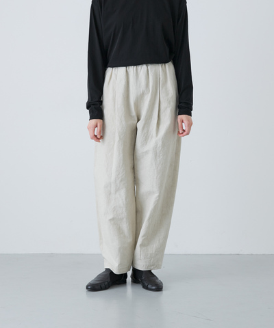 ウエストのタックが程よい立体感をもたらし、ヒップやもも周りに余裕がありながらも、裾のダーツがどこかすっきりとしたシルエット生み出しています。